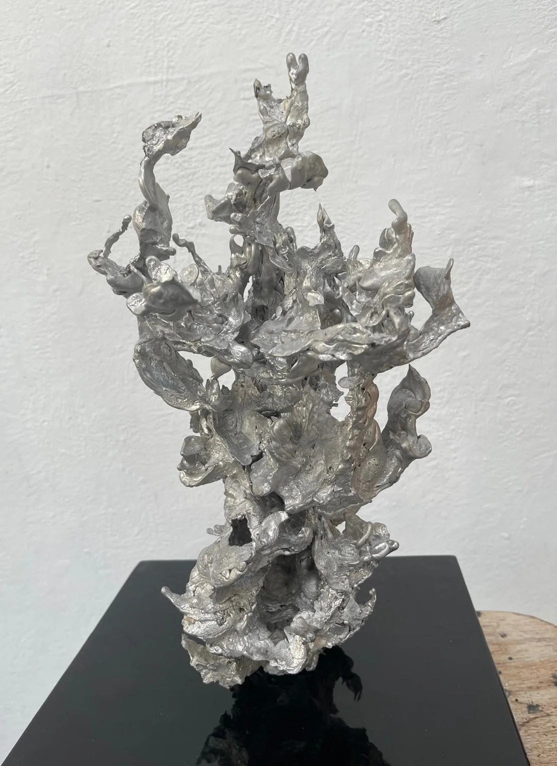 The Exhibition “Towards Gravity” includes the seven-part sculpture installation “Sternwarten M45”, cast in tombac, as well as selections from the „Dictation” and “Untitled” series. The installation “Sternwarten M45” (2024) is inspired by the Pleiades constellation. The individual sculptures are arranged throughout the space, echoing the celestial formation. The sculptures oscillate between familiar human forms and an abstract, rock-like presence. The Pleiades, an open star cluster in our galaxy, are visible in the spring sky almost everywhere in the world. Heralding the reawakening of nature, they have served numerous cultures as a means of temporal and spatial orientation in areas such as agriculture and seafaring. The Pleiades are also the subject of many myths and legends. In Greek mythology, for instance, they are said to be the daughters of the Titan Atlas. To escape persecution by Orion, Zeus transformed them into doves that rose into the sky and turned into stars. In Japanese mythology, they are known as 'Subaru' and symbolise unity and cooperation. Among the Australian Aboriginal people, they are sacred girls who perform at a 'corroboree', a large tribal gathering. The Pleiades are also regarded as ancestors and sources of spiritual wisdom by Native Americans, such as the Cherokee and Lakota. However, Masüger is particularly fascinated by a Kiowa legend. It tells the story of seven girls who climbed onto a rock and asked it to save them from a bear. The rock then grew towards the sky, lifting the girls up with it, and they transformed into stars.